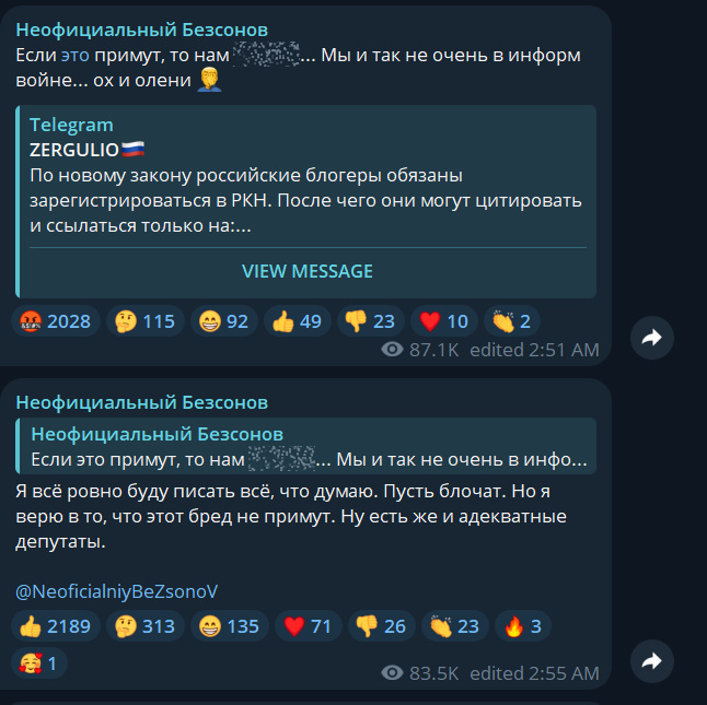 Там и на другом фронте проблемы: власти начали щемить зетанутых блогеров. Два канала уже в иноагентах, остальным приказано заткнуть пасть и писать только то, что несут первый канал и соловьёв.