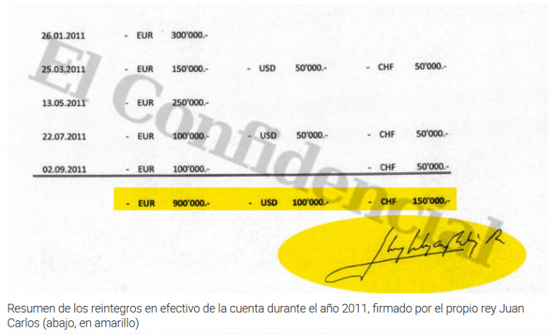 В испанском издании El Confidencial любопытная статья "Juan Carlos I sacó 100.000 euros al mes en billetes de su cuenta suiza entre 2008 y 2012".