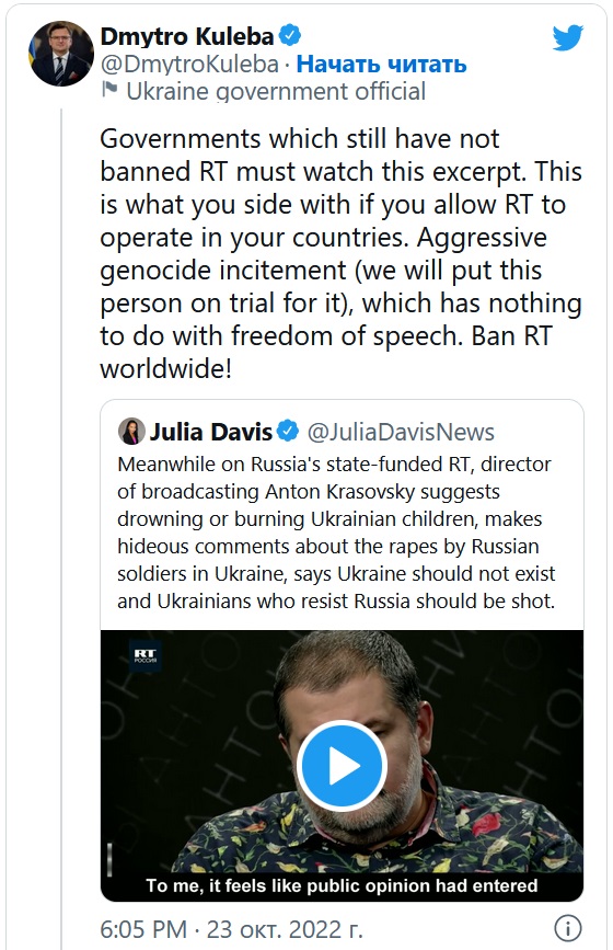 "телеведущий RT Антон Красовский в своей программе заявил, что детей, считающих, что Украина оккупирована Россией, следует топить в реке Тысине (река упоминается в песне, которая стала известна после реквиема по погибшим на Евромайдане в 2014 году)."