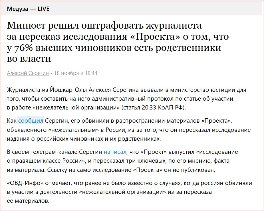 Самое смешное в этой конструкции то, что со временем по этой причине можно посадить всё население Мордора - "за недонесение на иноагента Сергея Маркова" 😄))