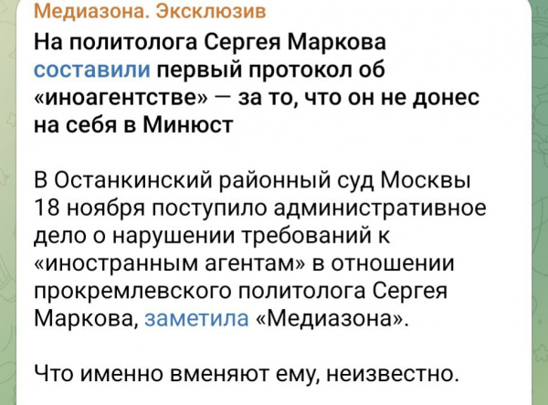 На иноагента Маркова составили протокол за то, что он сам на себя не донес. Помнится, Марков горячо приветствовал закон об "иноагентстве", говорил, что вот сейчас-то всех этих предателей, работающих на врага, прищучат.