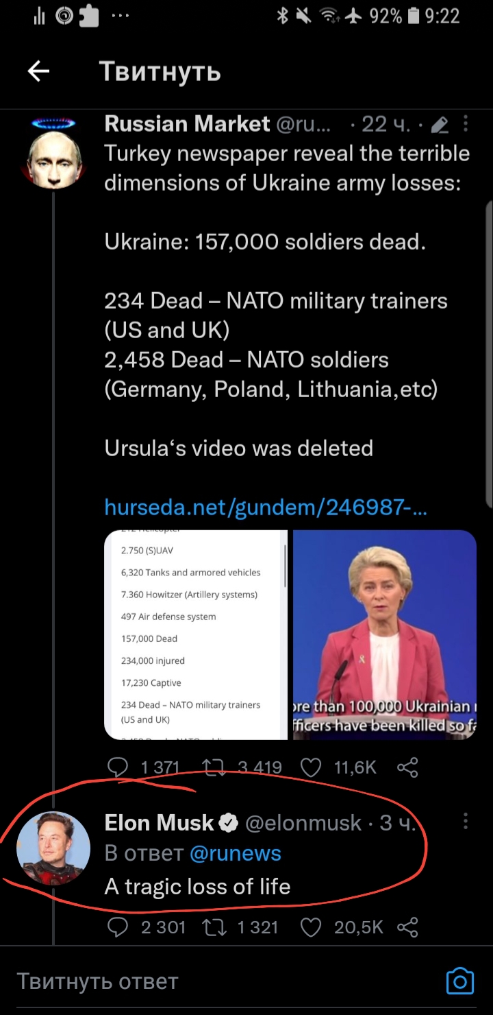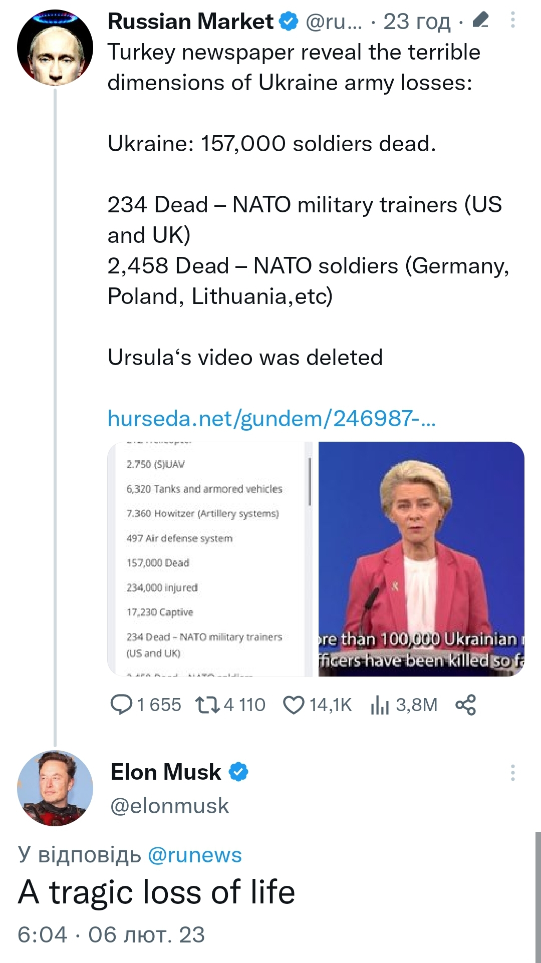 Ну так позиция российских либералов давно известна - можно и нужно пожертвовать всеми украинцами, лишь бы не было ядерной войны. Шантаж работает. Хорошо, что российские либералы абсолютное никто, в отличие от Маска. Его постоянно испачканные портки на обозрении у сотен миллионов.