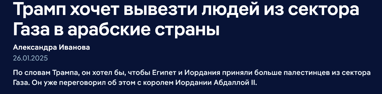 "По итогам встречи в Каире министры иностранных дел Саудовской Аравии, Катара, ОАЭ, Египта, Иордании, ПА и Лиги арабских государств опубликовали совместную декларацию против плана Трампа выселить палестинцев из Газы. В декларации заявляется, что арабские страны не примут к себе палестинцев "ни при каких обстоятельствах"
