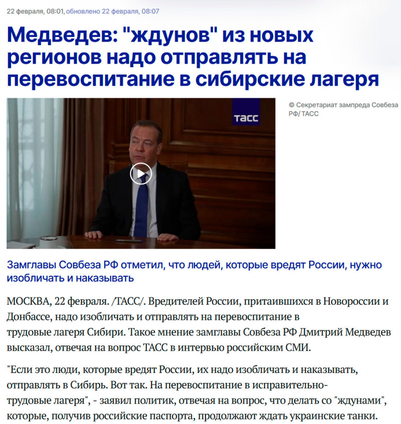 «для достижения целей спецоперация придется дойти до Киева». «Ждунов из новых регионов» надо отправлять на перевоспитание в сибирские лагеря».