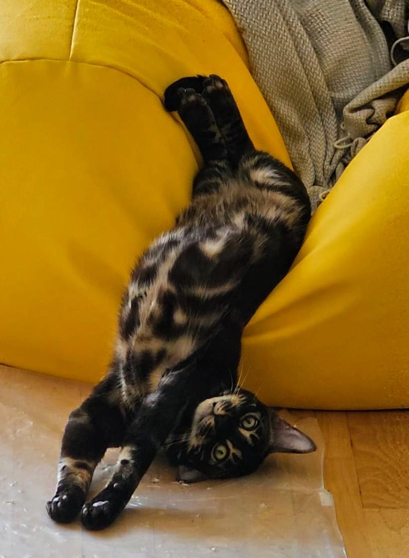 По легенде, найдена в коробке около стройки (на самом деле, жена строителя, который принес домой очередного (четвертого) котенка и который перекочевал к нам, подозревает, что он таким образом помогает друзьям раздавать котят).