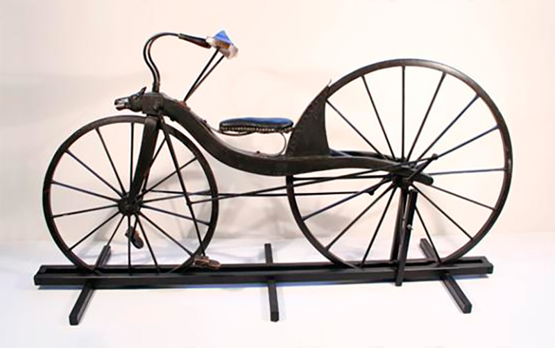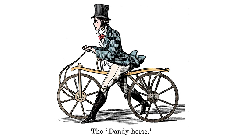Официальным годом рождения велосипеда считается 1817-й, когда немецкий барон Карл Дрез оформил патент на Laufmaschine (машина для пробежек). Педалей эта модель не имела: чтобы передвигаться, нужно было отталкиваться ногами. По сути, это был самокат, который в 1818 году усовершенствовал англичанин Денис Джонсон, назвав его dandy horse ("лошадь для денди") и стал успешно продавать.
