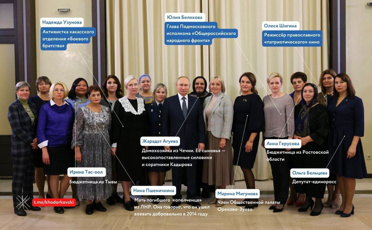 "О том, что Путин встретится с родственниками мобилизованных стало известно примерно три недели назад. Это значит, что аврала не было, было время на подготовку. Тот факт, что спустя три недели на встречу притащили чиновниц и провластных активисток, можно смело интерпретировать как доказательство того, что среди простых людей таких родственников мобилизованных, кто был бы в достаточной степени лоялен, найти вообще не удалось. То есть, вдумайтесь ещё раз: у них было три недели и вдобавок весь административный аппарат страны, а они не смогли найти пару десятков матерей мобилизованных, которые были бы довольны происходящим и позитивно настроены по отношению к режиму.