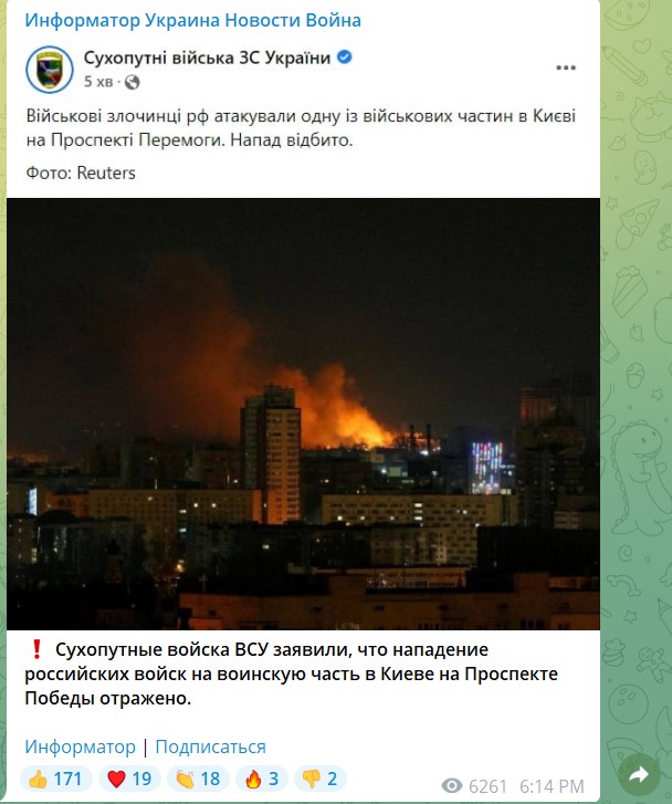 Эта ночь будет более тяжелой, чем день. Под ударом многие города нашей страны: Чернигов, Сумы, Харьков. <…> Особое внимание к Киеву. Нельзя потерять столицу. <…> Этой ночью они пойдут на штурм. Мы все должны понимать, что нас ждет. Этой ночью мы должны выстоять.