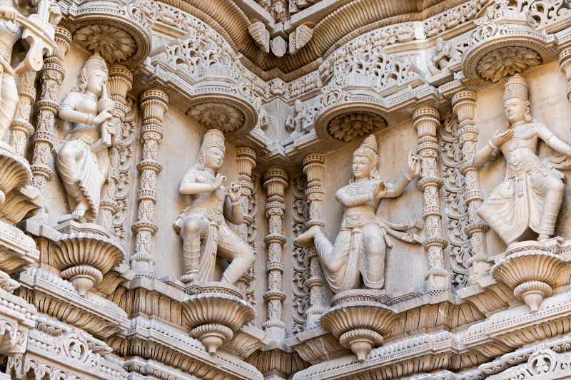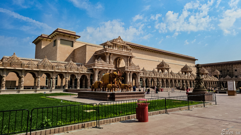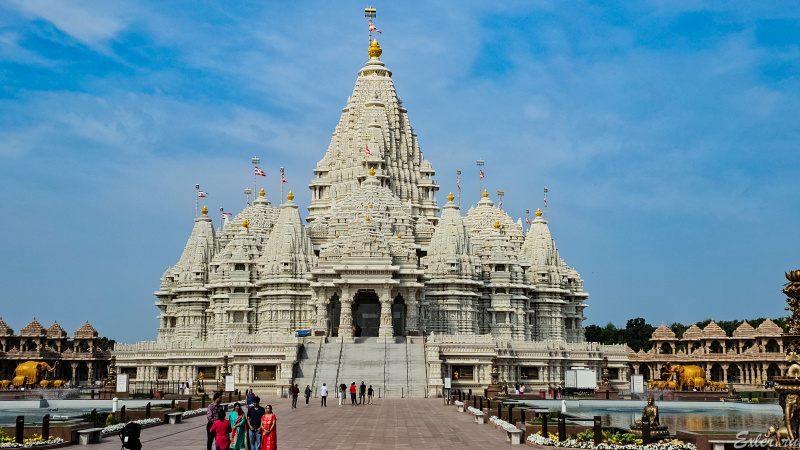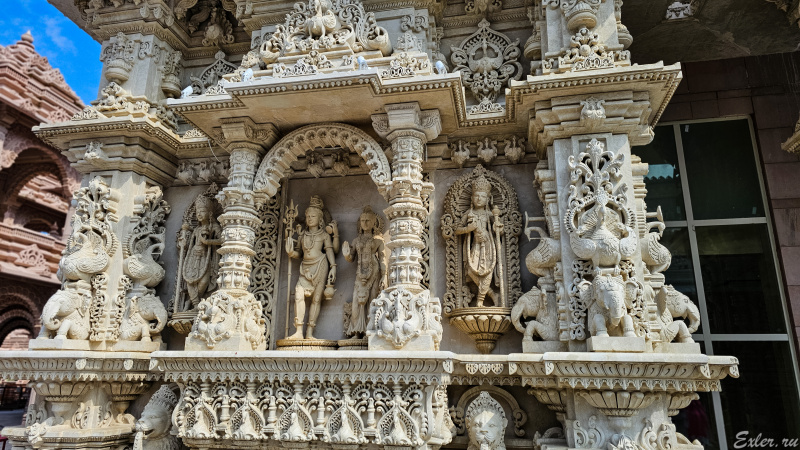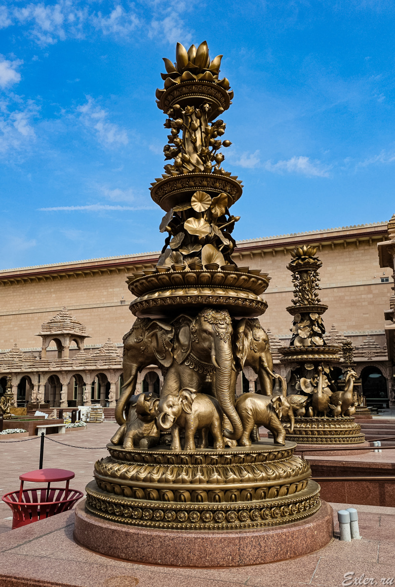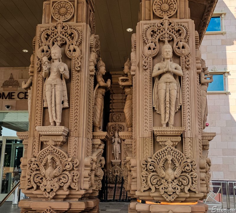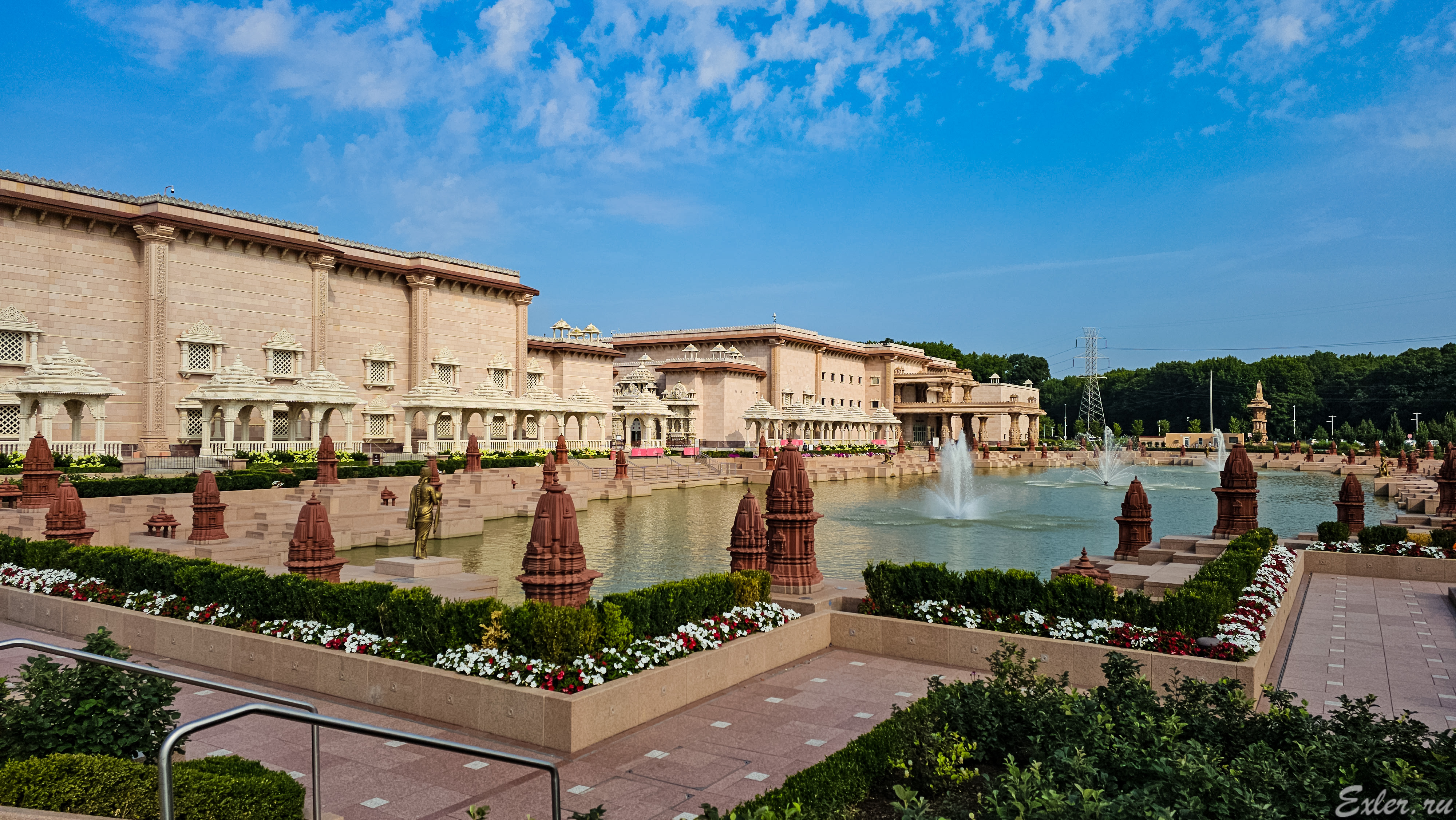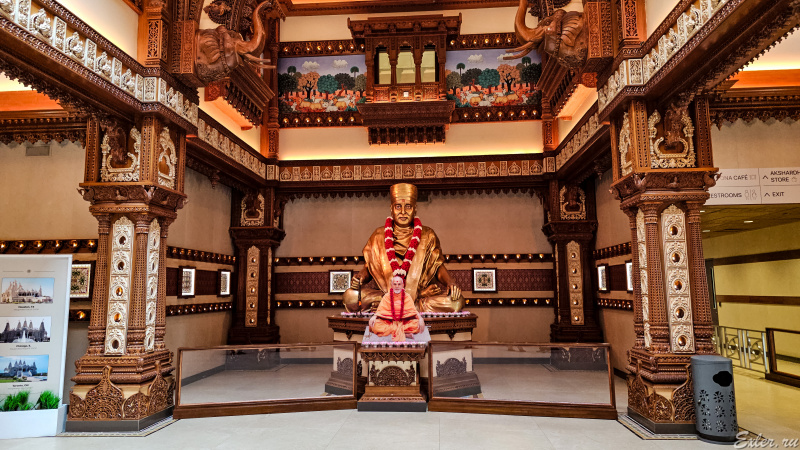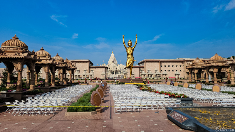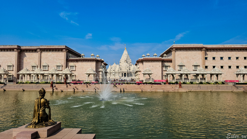 Если подходить к комплексу с лицевой стороны, то прямо на нас смотрит статуя святого Сваминараяна: собственно, храм посвящен этому святому, а строительством храма занималась организация BAPS (Бочасанваси Шри Акшаром Пурушоттам Сваминараян Санстха) - крупнейшая религиозная и гражданская организация, действующая в рамках сообщества Сваминараян.