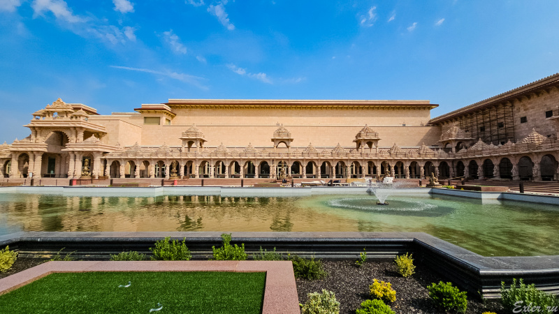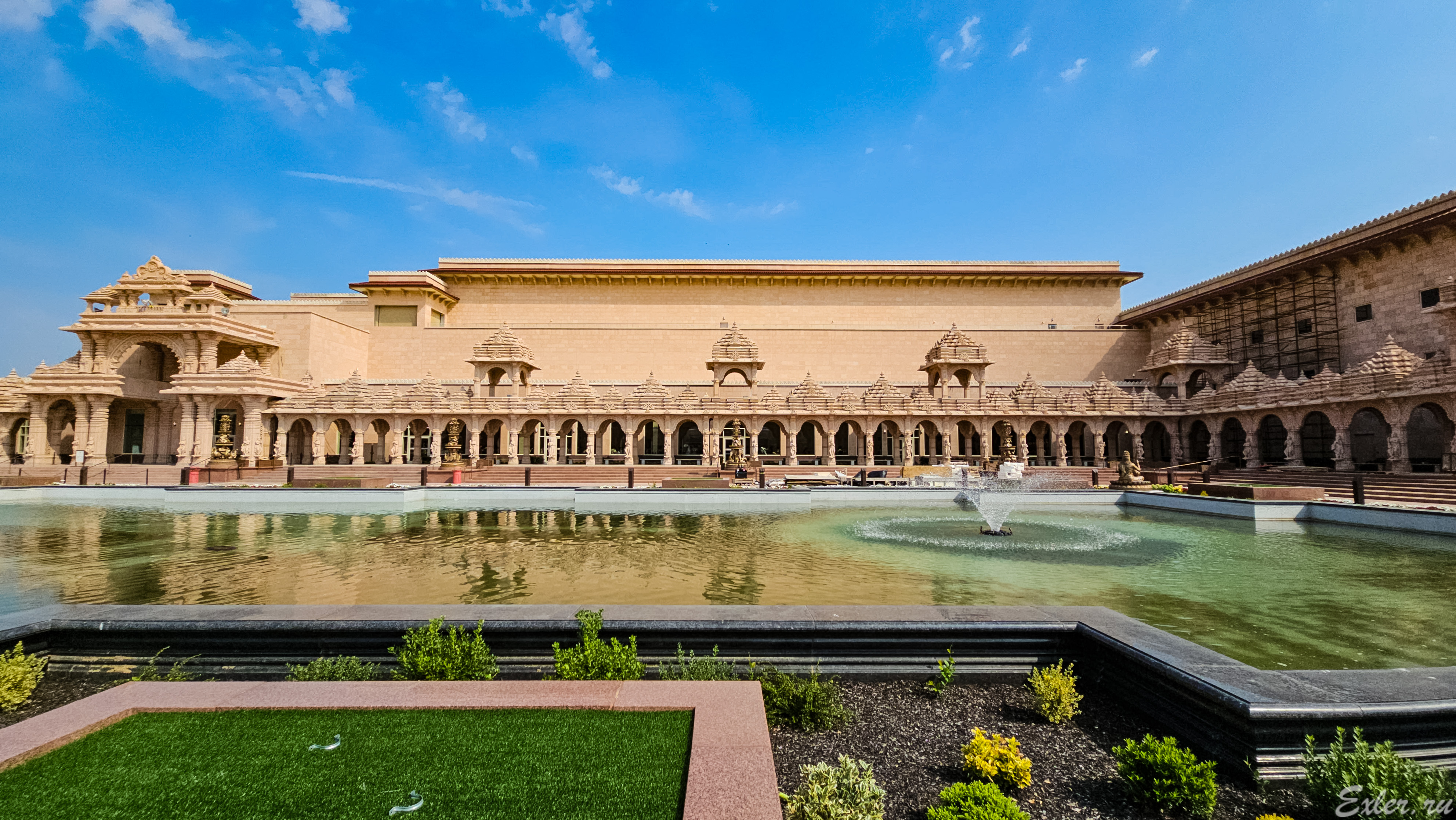 Вид на храм со стороны водоема. По краям водоема стоят четыре статуи, символизирующие четыре святых реки  Индии: Ганг, Ямун, Сарасвати и Сарью.
