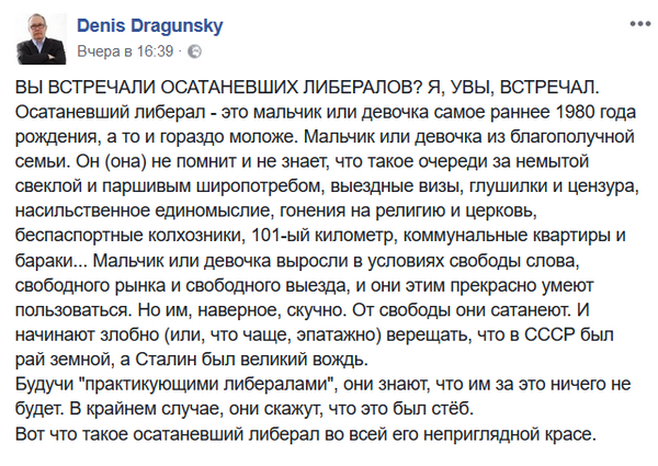 По-моему, ключевое слово тут - "практикующие либералы", взятые автором в кавычки. Если я правильно понял его мысль, то он говорит о людях, которые на практике с удовольствием пользуются теми достижениями либерализма, которые у нас, хоть не в большом количестве, но имеются. При этом они сами себя вовсе не обязательно считают либералами, примерно так же, как многие люди с удовольствием пользуются достижениями науки в виде смартфонов, компьютеров, синтетических тканей и т.п., но при этом искренне не любят науку. И про то, что любителей Сталина и совка сейчас очень много среди тех, кто ни того, ни другого не застал, тоже правда. Так что я согласен с тем, что написал Драгунский. Просто надо сделать поправку на то, что ради иронии, сарказма слова могут употребляться в противоположном значении. По-моему, это как раз тот случай.