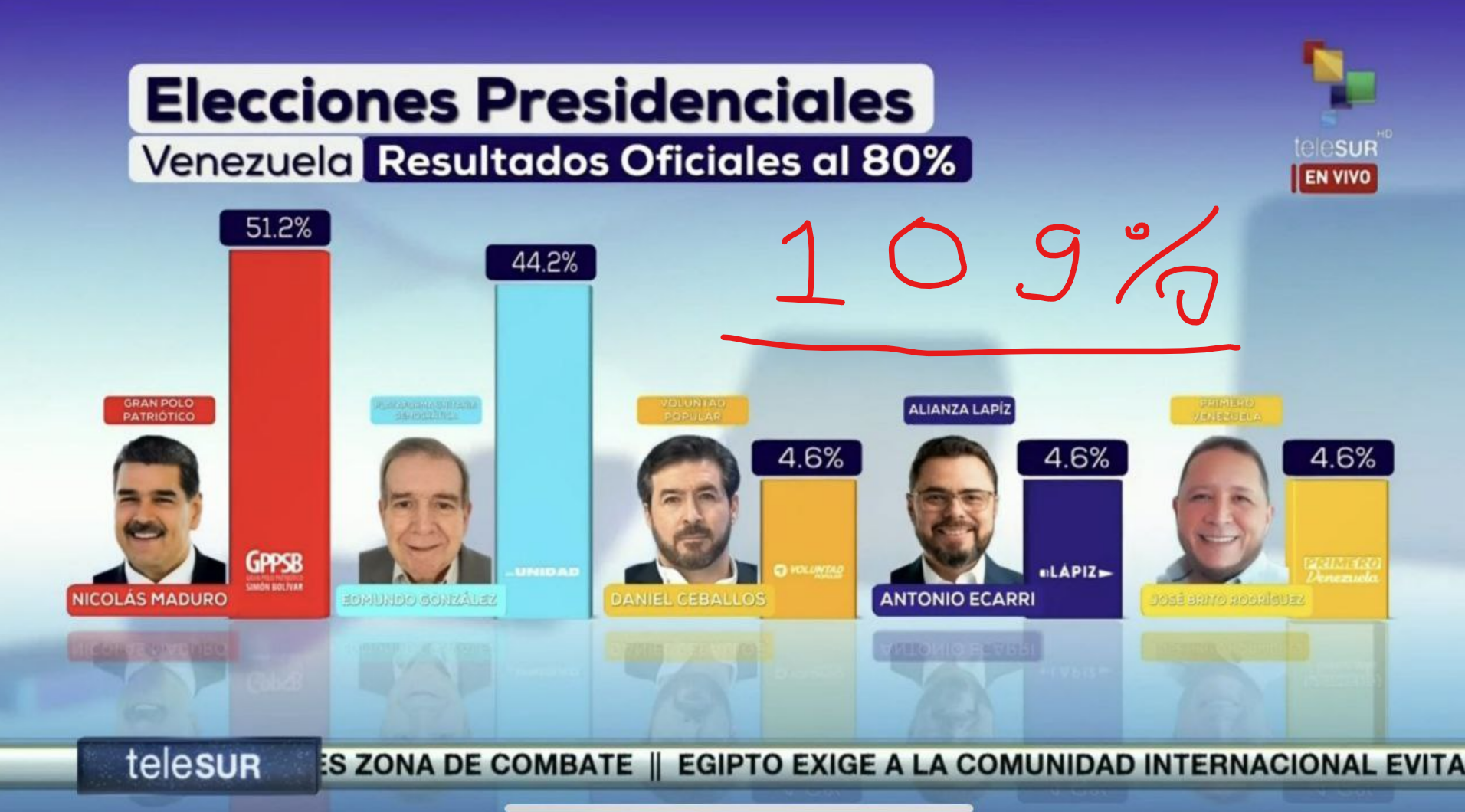 Подсчет голосов на выборах в Венесуэле еще не закончен, но верный продолжатель дела Уго Чавеса Николас Мадуро уже дважды объявил о своей победе. Он почему-то не стал себе рисовать 88% голосов, постеснялся, но заявил, что победил с перевесом в 51,2%. При этом по данным экзит-поллов побеждал кандидат от оппозиции Эдмундо Гонсалес.