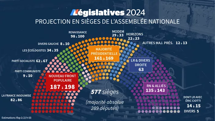 Классические правые перед выборами тоже раскололись на две части. Меньшая примкнула к лепеновцам и шла с ними общим избирательным списком. Большая не захотела этого делать и пошла на выборы отдельно, но не исключает сотрудничества с крайне-правыми там, где у них есть программное сходство. Это даст крайне-правым и лепеновцам примерно 200 голосов в сумме — гораздо меньше 289, необходимых для большинства.