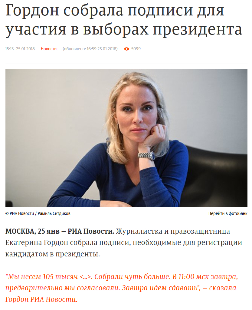 Извините, но реально из "самовыдвиженцев" подписи могут быть собраны только у ВВП. Потому что в каждом ТЦ стоят сборщики, все многочисленные ГУП-ы собирают централизованно (как сказали моей теще - подписи ставить никто не обязан, но список тех, кто подписался, пожалуйста предоставьте). Навальный собрал бы (он их заранее собрал в три раза больше), если бы его зарегистрировали. А остальные, включая Собчак, могут хоть нераспечатанные пачки бумаги принести в ЦИК, их регистрация зависит только от того, одобрили их кандидатуру для участия в клоунаде (Собчак - одобрили), или нет.
