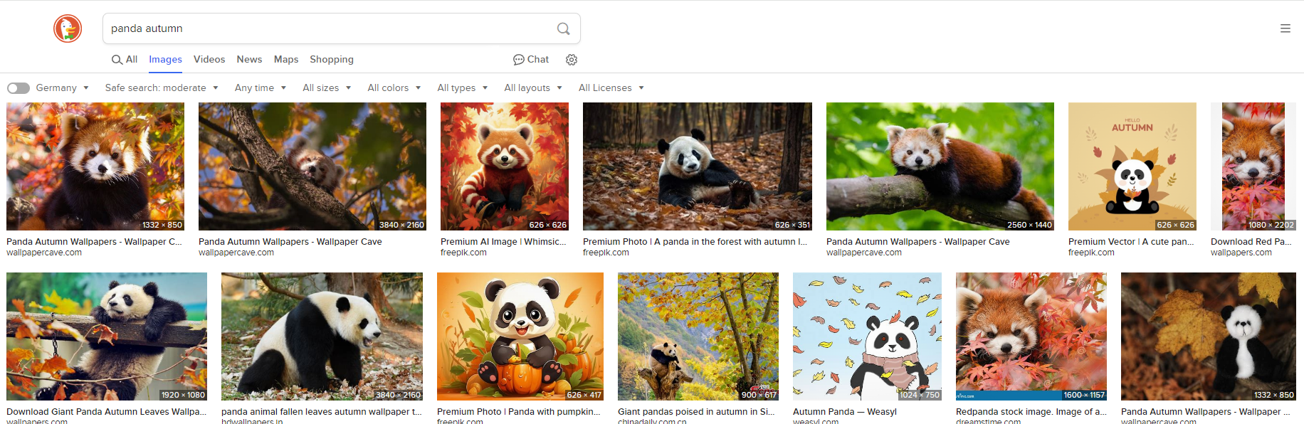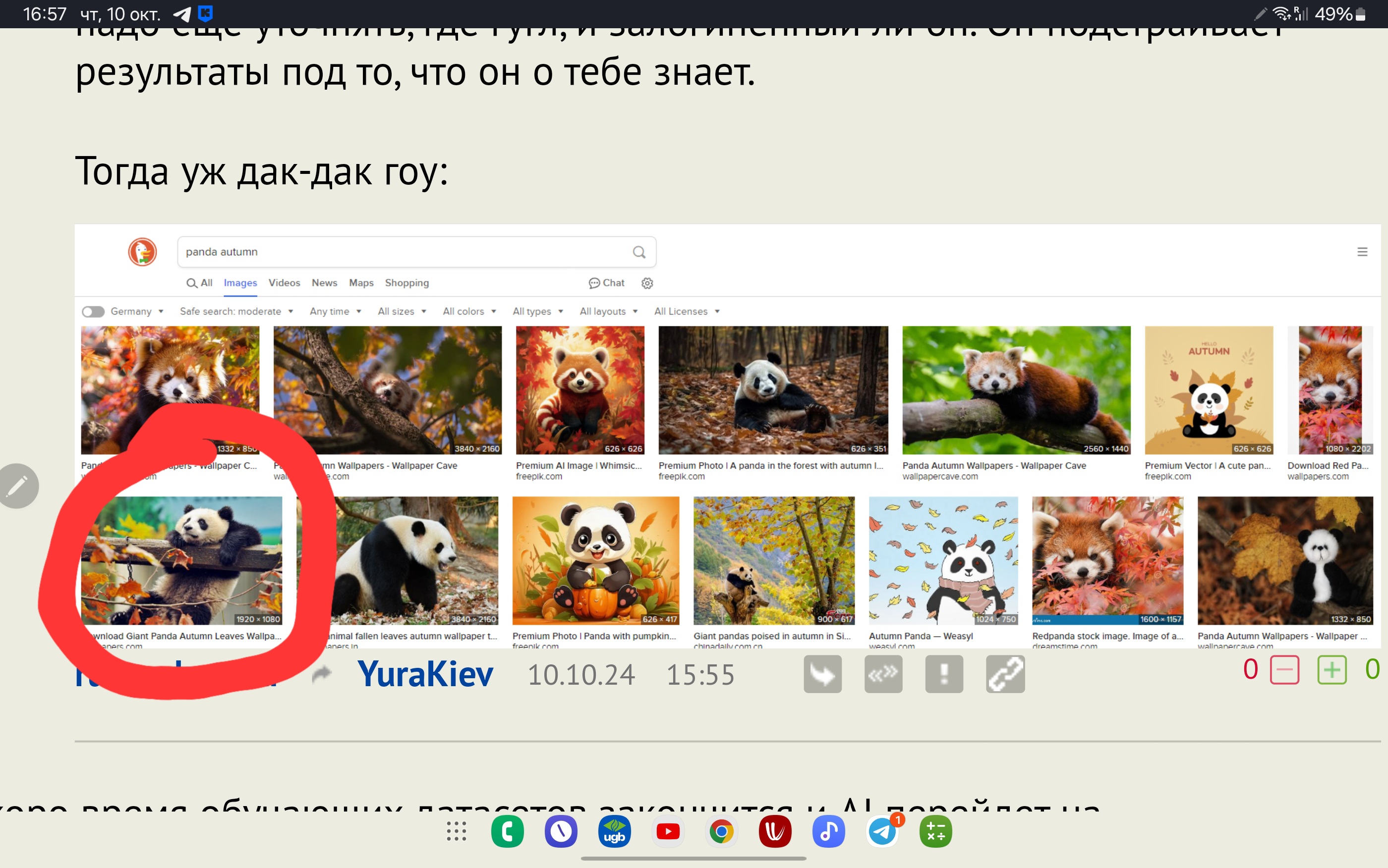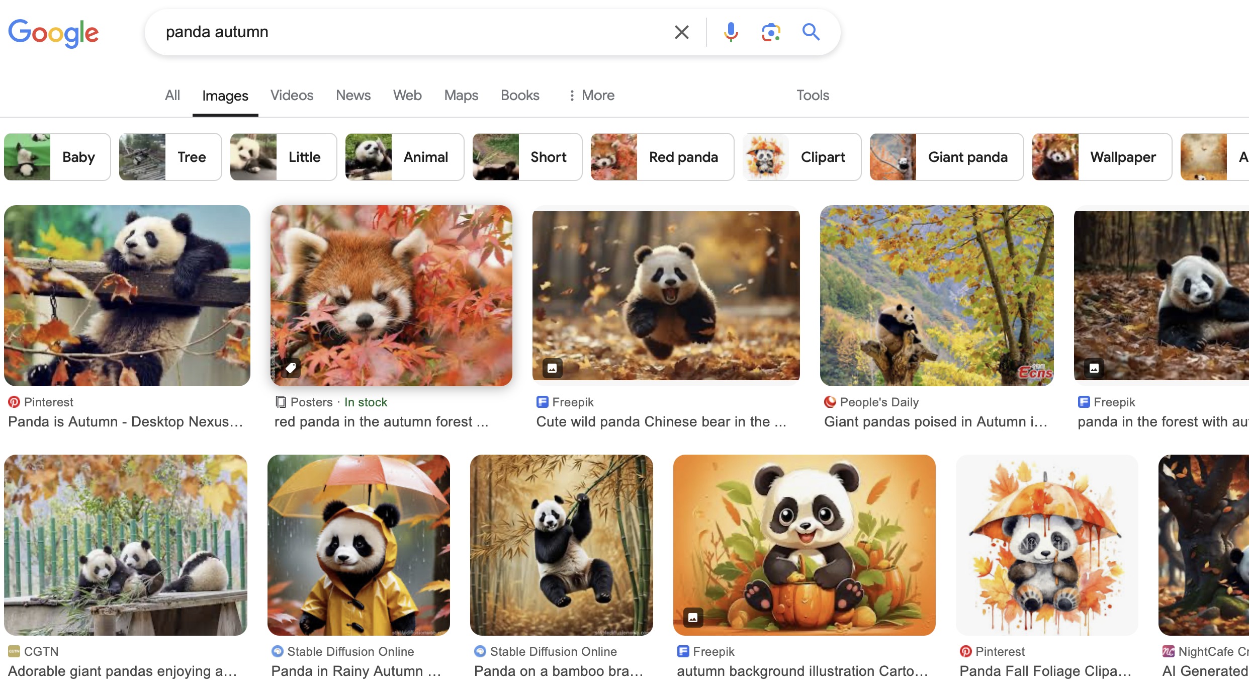 Если набрать в гугле "panda autumn" , то на первом месте реальная картинка (фото моей жены), а далее идут в большинстве своём нарисованные мультики или ИИ.....
