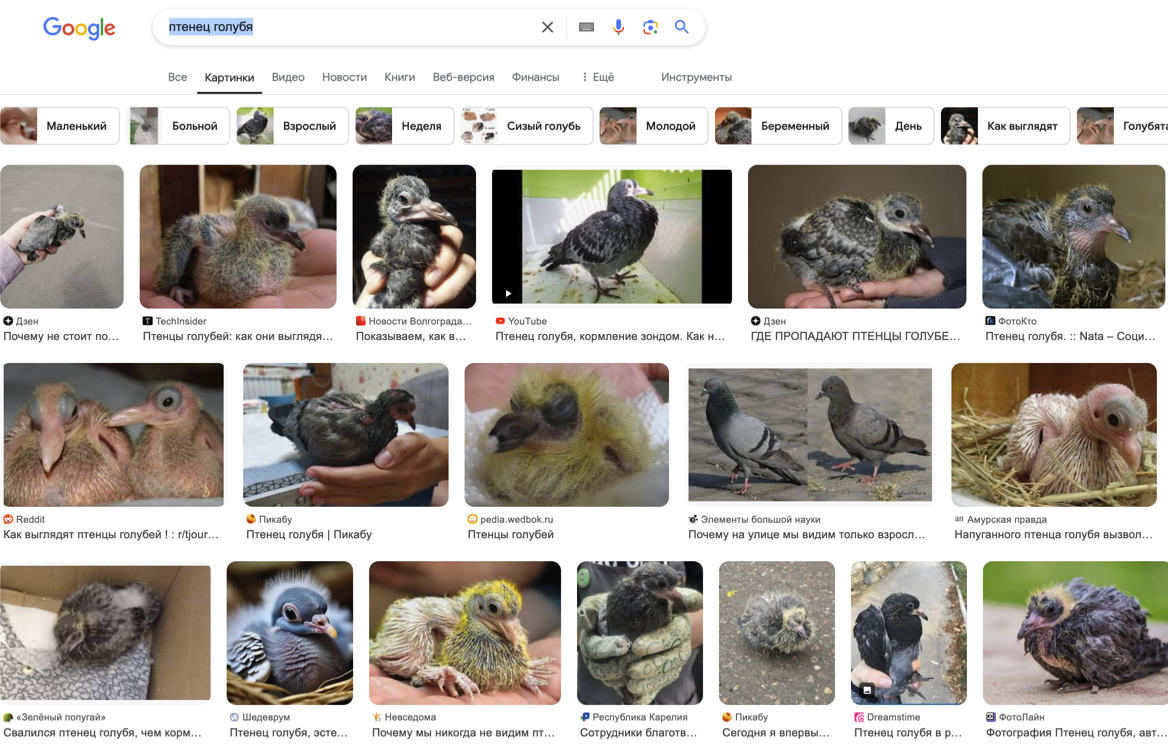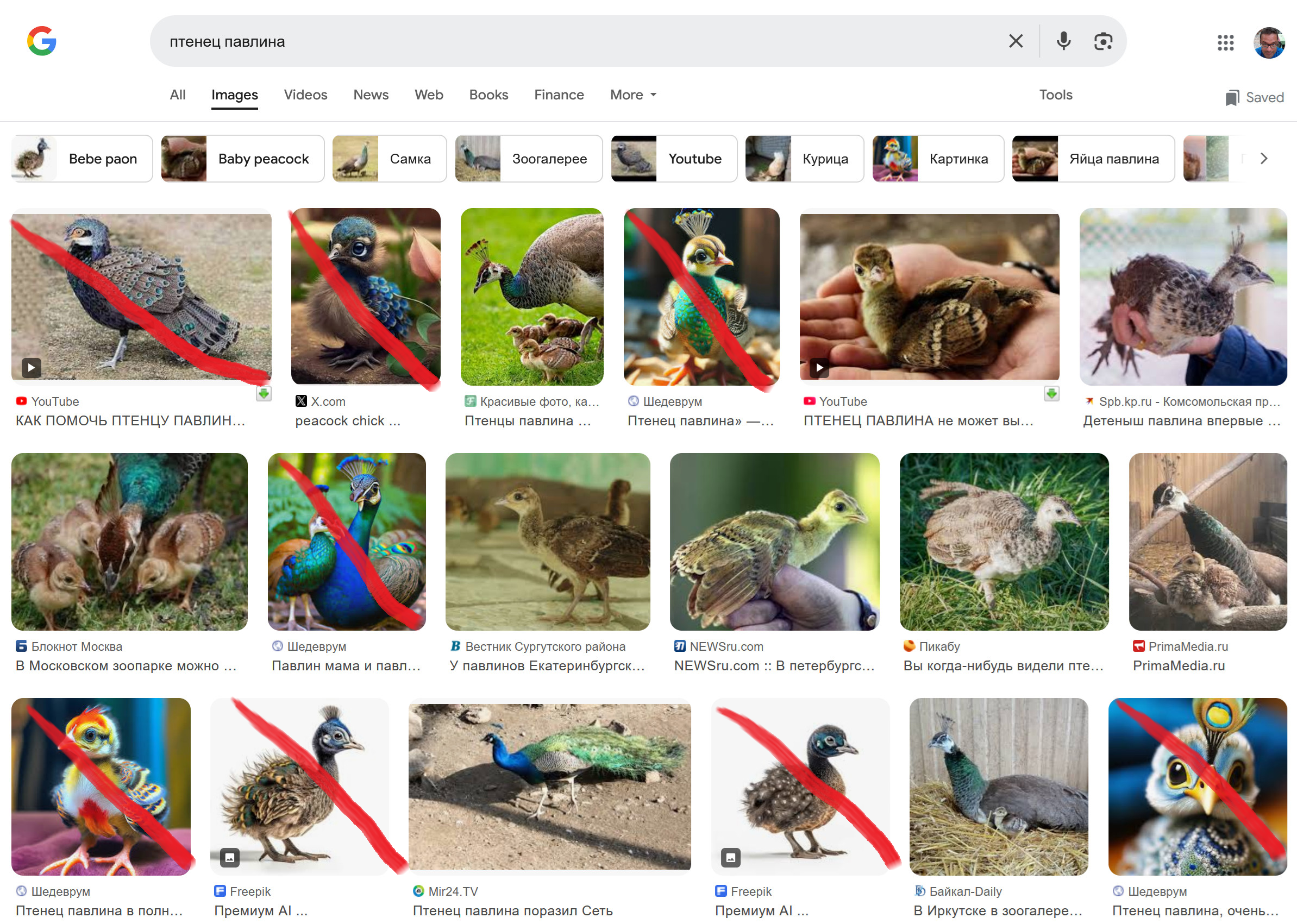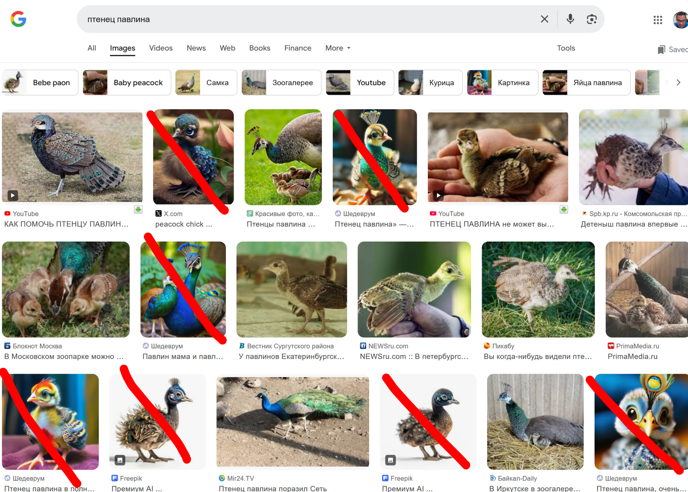 Кстати поисковый алгоритм Гугла, даже если ввести baby peacock photo, все равно выдает не только фото, но и сгенерированные картинки. Не соображает, что фото надо, а нарисанное не надо.