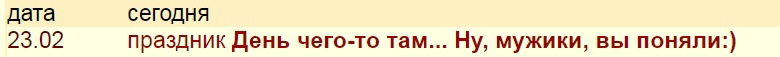 22 февраля шеф собрал кафедру отметить праздник, пироги, бутылка вина, и речь шефа, в которой он не использовал слова "защитник", "армия" и "отечество", а поблагодарил всех, включая наших женщин, за удачно проведенную олимпиаду.