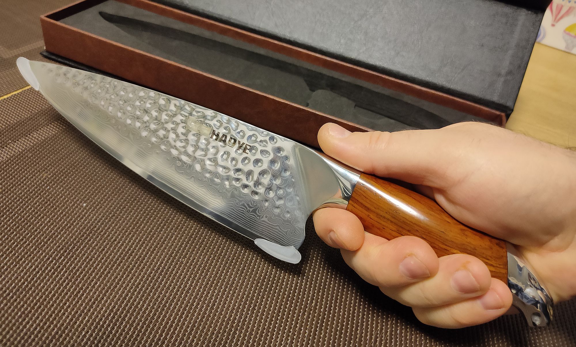 Случай представился - как раз решил себе для кухонного комплекта взять большой шеф-нож дюймов 8 - 8,5 - взамен икеевского, который уже старый и имеет дефекты.