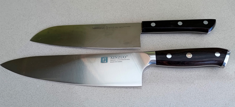 А это он рядом с моим сантоку Samura Harakiri. Данный нож побольше, но я как раз такой и хотел.