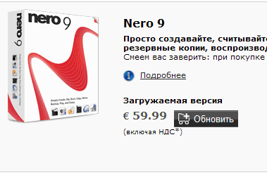 Nero сообщил мне о том, что вышла девятая версия. Пошел обновляться с восьмой. На сайте у них четко написано - загружаемая версия стоит 59,99 евро.