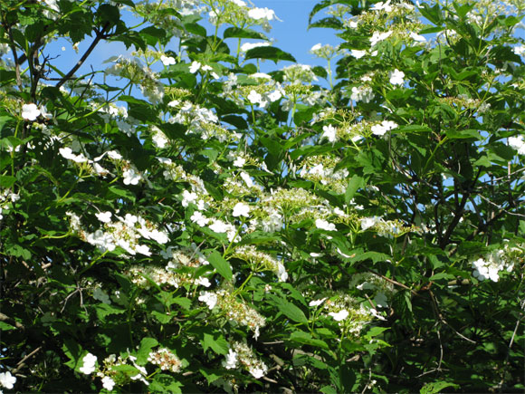 На первом снимке калина. Пока цветёт, но ягодки будут вполне съедобные.