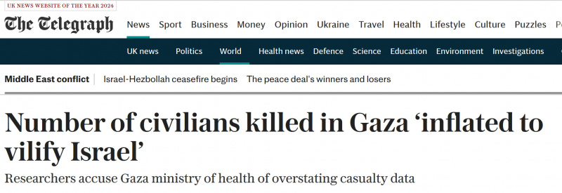 Издание The Telegraph опубликовало статью  "Number of civilians killed in Gaza "inflated to vilify Israel" ("Число убитых мирных жителей в Газе "раздуто, чтобы очернить Израиль"").