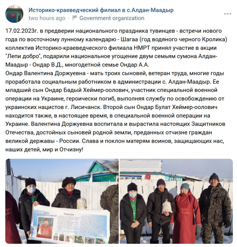 В Туве двум семьям, сын одной из которых уже утилизирован в Украине, а сын другой там пока воюет, вручили по пакетику пельменей в рамках акции "Лепи добро". Ширится номенклатура поддержки семей утилизированных орков. Одним семьям досталось по барану, другим по мешку картошки. Про шубы это был фейк, как выяснилось, шубы вручили, сфотографировали, а потом забрали. Ну и вот теперь пельмени. Будем надеяться, что после фотографирования пельмени все-таки не отберут.