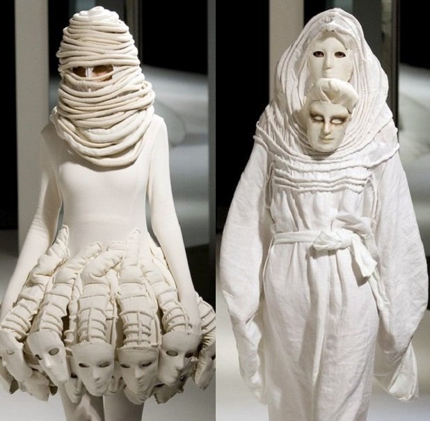 Некоторые из этих нарядов отлично подошли бы к Домам ужасов, которые очень популярны в Японии и Корее. Да и в других парках развлечения такие есть. Представьте, в темноте Дома вы идете с фонариком, и вдруг из темного угла вылазит фото 3 как эдакая Садако. Да почти каждая из этих моделей способны неподготовленного человека до нервного срыва довести! Хотя, нет, не разрешат, это было бы слишком жестоко. Человека со слабым сердцем эти арт-объекты убьют нафиг, не напрягаясь. Мода массового поражения...