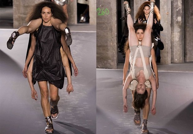 Это уже совсем непонятно. Безумная одежда - ладно, кто знает, может лет через 200 люди такое и будут носить, но зачем человека таскать вверх ногами? Это как вообще объяснить?... Это же ещё и тяжело, как эта бедная девушка выдержала