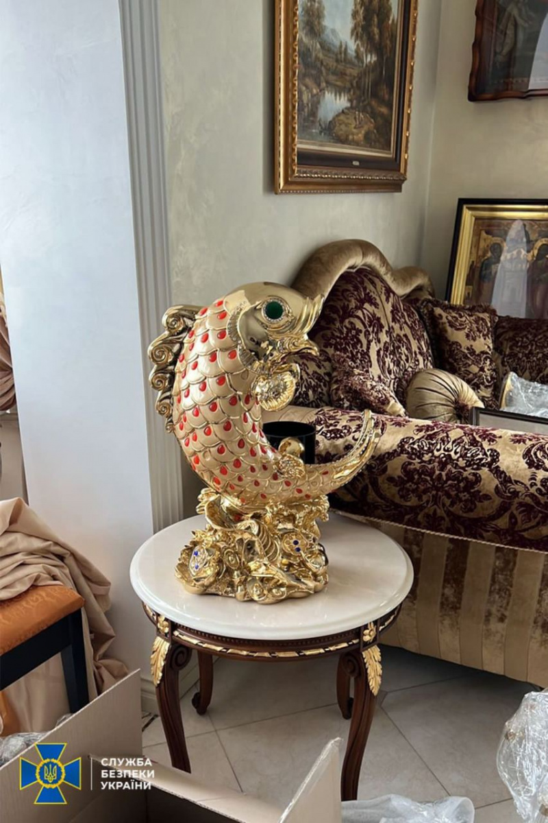 Среди различных предметов роскоши сотрудники обнаружили здоровенную золотую рыбу, инкрустированную драгоценными камнями.