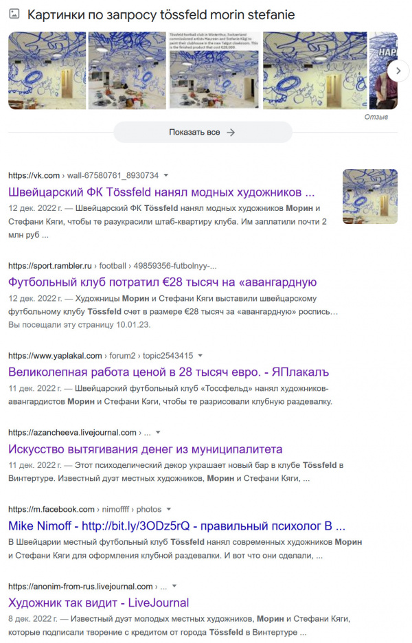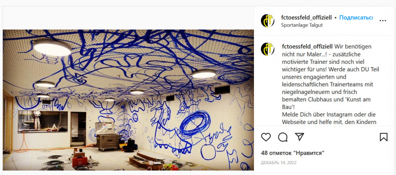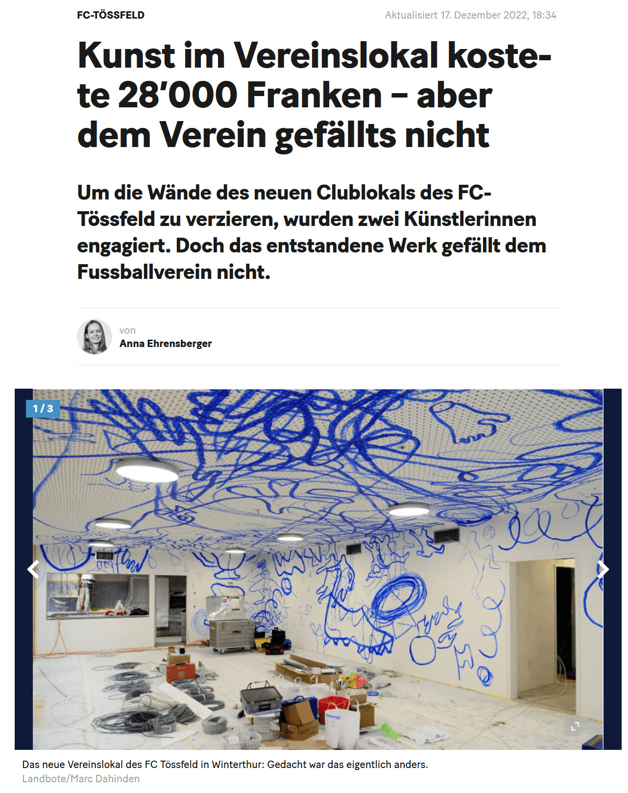 Там все объясняется и, в общем, полностью подтверждается. Действительно городской совет Винтертура заказал художницам Морин и Стефани Кяги оформление нового футбольного клуба "Тёссфельд" и заплатили за это 28 тысяч евро. В Сеть кто-то слил вот эту фотографию еще не законченного помещения, после чего начался большой скандал.