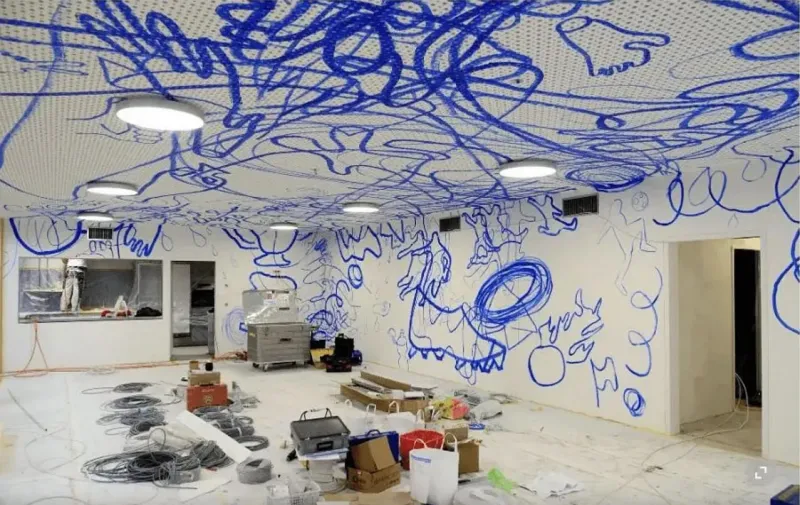 Пару раз по соцсетям пробегала эта фотография, а в подписи к ней говорилось, что это, мол, раздевалка швейцарского футбольного клуба Tössfeld, которую расписали авангардные художницы Морин и Стефани Кяги, и они выставили за это произведение искусства счет в 28 тысяч евро.
