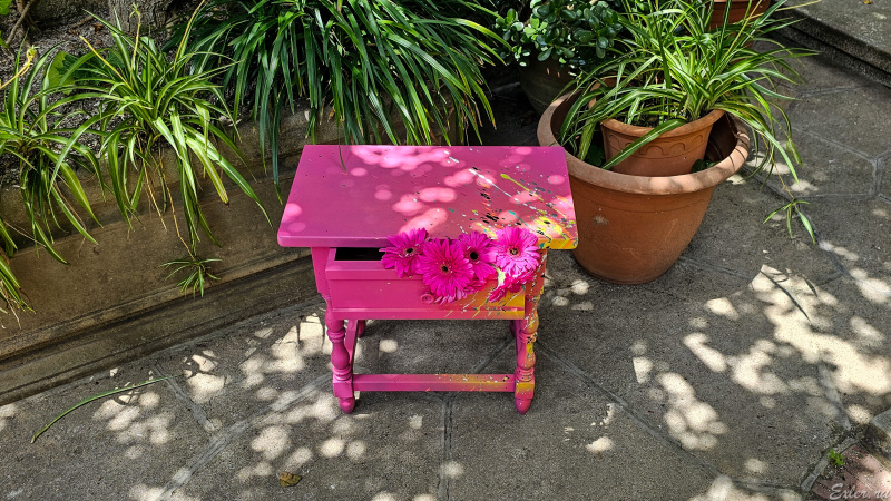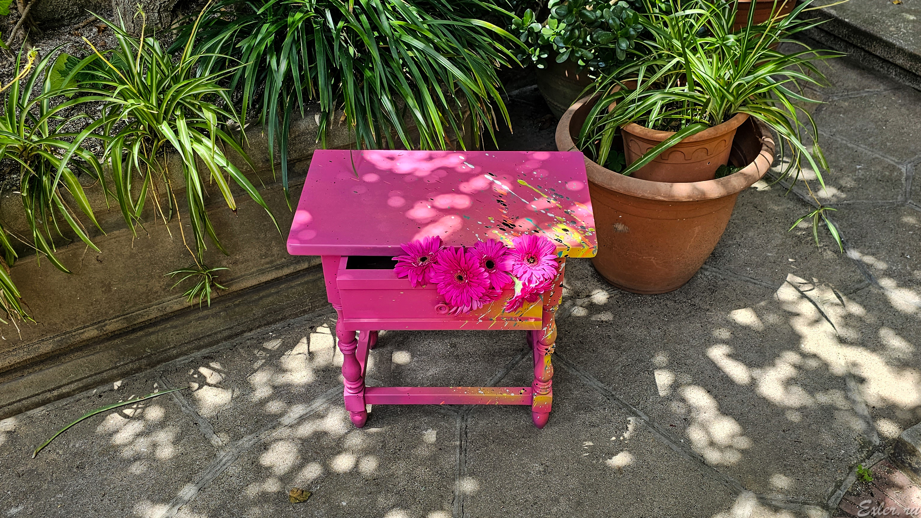 Основная идея была покрасить предметы мебели розовым и весело расплескать на них краски разных цветов, но временами выглядело, если честно, как будто эти предметы просто отметили птички.