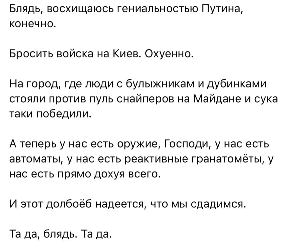 Совсем поехавший старик Путин не понимает одного - можно добиться ситуативной победы, залить Украину кровью гражданского населения. Но ненависть, которую он посеял, никуда уже не уйдет. Невозможно заставить быть братьями насильно. Невозможно 40 миллионный народ все время держать в неволе. Убитых Путиным детей, расстрелянные мирные города мы никогда не забудем.