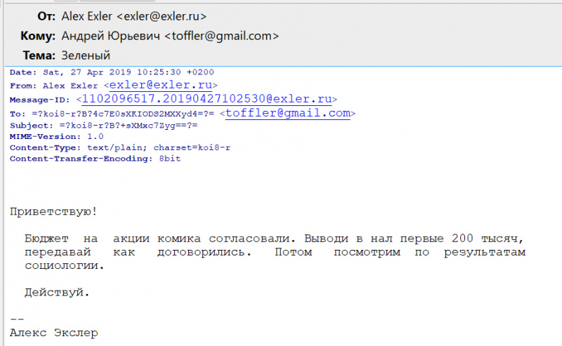 В ответ на это Андрей Юрьевич пишет письмо на адрес штаба Зеленского в городе Николаеве (mykolaiv@ze2019.com), где стоят лишь две цифры — 4 и 200. Как можно понять по контексту предыдущего письма, подразумевается, что согласовано 4 транша по 200 тыс.