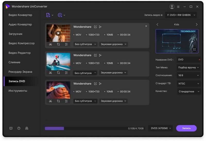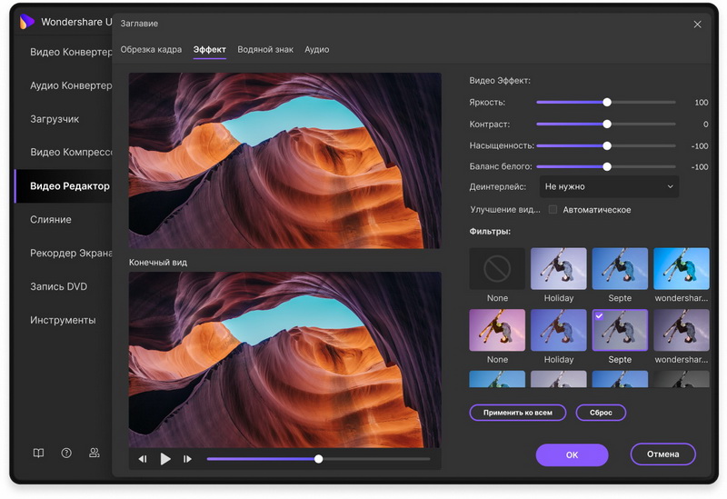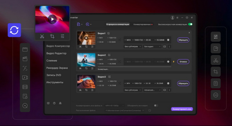 Wondershare UniConverter - конвертирование аудио и видео практически любых форматов, загрузка роликов с различных платформ, видеоредактор, запись с экрана и веб-камер, работа с DVD и Blu-Ray