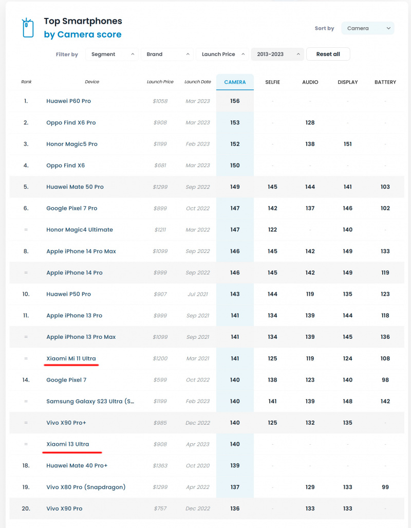 Обратил внимание на то, что новый суперфлагман Xiaomi 13 Ultra в рейтинге DXOMark имеет достаточно невысокую (для суперфлагмана) оценку и в рейтинговой таблице находится аж на 19 месте.
