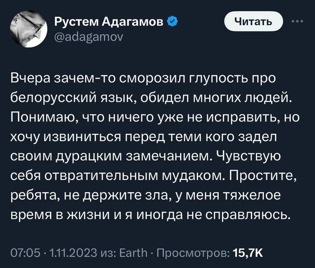 Мы будем травить человека, так много делающего для борьбы с путинским режимом и дающего надежду и отдушину миллионам единомышленников, из-за мелкого сгоряча сказанного недоразумения? Кто из нас не проявлял великоимперский шовинизм, называя смешными языки оккупированных национальных республик и вопрошая, почему в них туземцы не разговаривают на нормальном общепринятом языке метрополии? И вообще, что-то в последнее время все стали слишком обидчивыми. Я, может быть, и не поддерживаю высказывание Адагамова, но я рад, что существует разнообразие мнений!