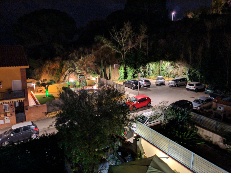 Ночью в темноте при свете уличных фонарей. И это Google Camera, которая сюда встает нормально. Действительно - чудеса творит. Подсвеченный куст на переднем плане - это то, что делает HDR+ приложения Google, потому что родная софтина из этого куста делает просто мутное пятно. Я в обзоре все подробно покажу.