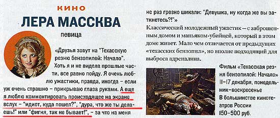 Да они заколебали на самом деле. Попадется такая дурища на заднем ряду и вопит что-то весь фильм. Ужас.