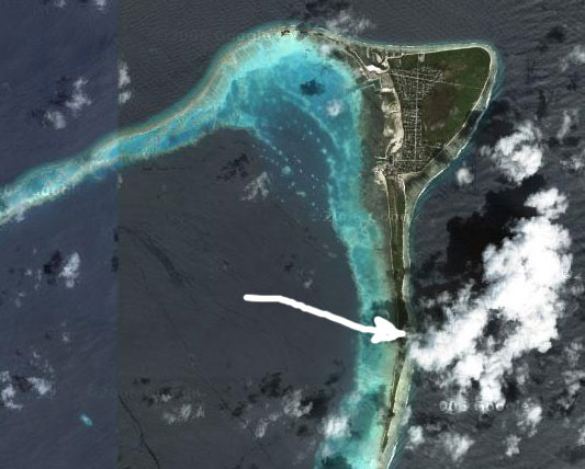 Остров, как я и писал в статье, называется Herathera. Он входит в атолл, располагающийся в южном полушарии. Стрелка на спутниковом фото указывает на нашу виллу.