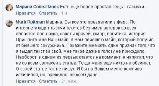 Марине прислали ссылку на эту перепечатку. Она пришла в комментарии к перепечатке и вежливо спросила Марка, почему он не указал авторов, не поставил ссылку и даже просто не предупредил, что это цитата - в таком виде все считают, что это статья Ройтмана. И настоящих авторов эта ситуация по какой-то странной причине не устраивает - вероятно, что-то гормональное.