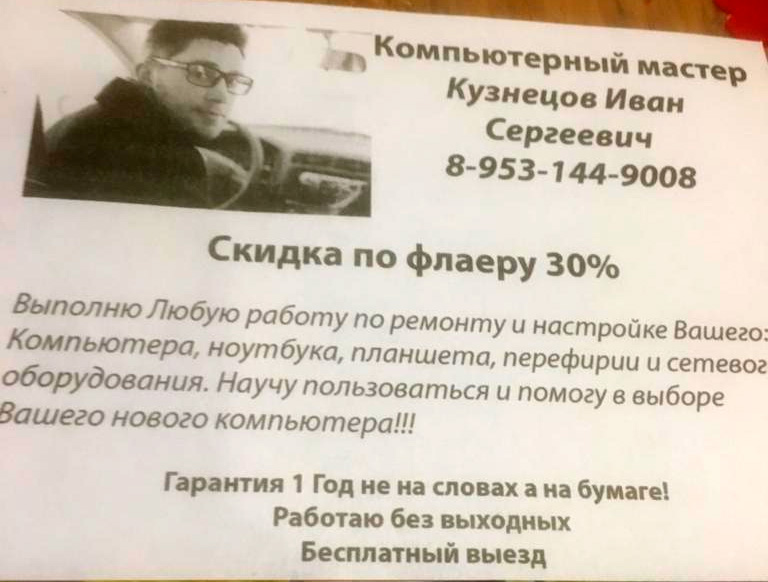 P.S. Правда, я бы такое совершенно безграмотное (8 ошибок) объявление никогда в жизни бы не написал, но это уже другой вопрос.