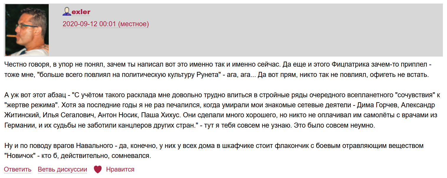 Ваш "товарищ по палате" повествует исключительно о личности самого Навального (и в довольно большом ряде моментов я с ним даже согласен). Но ни разу не про собственно тему отравления – а ведь именно этот вопрос сейчас и обсуждается.