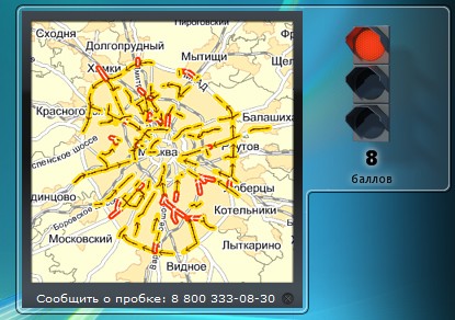 Для пользователей Vista - Яндекс выпустил Яндекс.Пробки в виде гаджета/виджета (скачать). В свернутом виде он выглядит как светофор с количеством баллов, в развернутом - в виде небольшой карты. Очень удобно. (мечтательно) Эх, еще бы такой виджет под Yahoo widgets (я их под XP использую)...