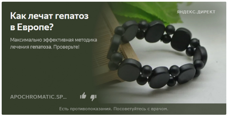 А теперь Яндекс.Директ пробил очередное дно - по нему идет активнейшая рекламная кампания (попадается десятки раз на дню в Яндекс.Дзене) галимого шунгитового браслета (который они называют нефритовым) в качестве - лекарства от гепатоза. Совсем уже охренели, просто слов нет!