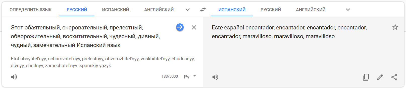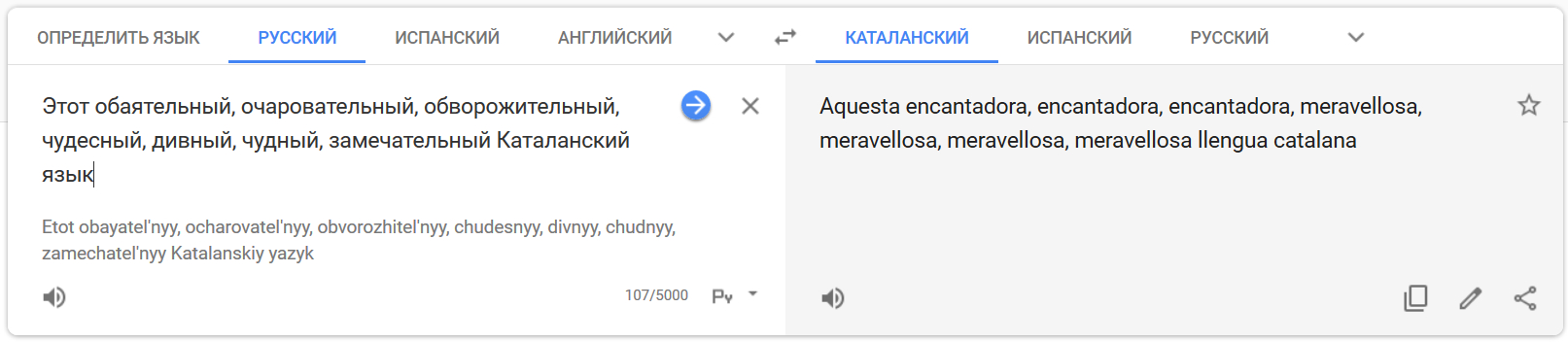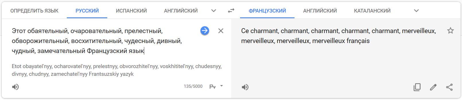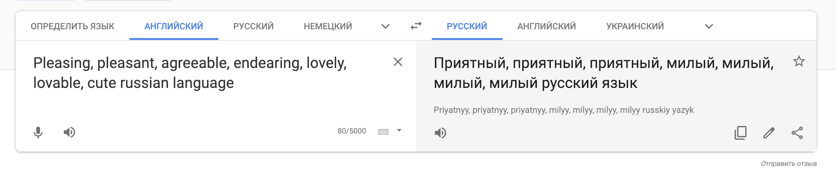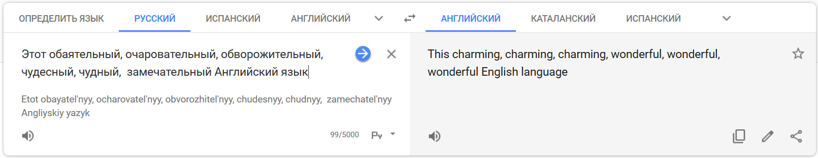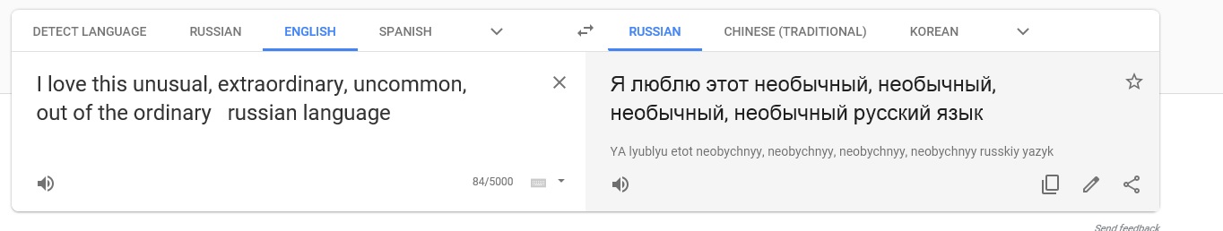 Многие распространяют эту хохму как демонстрацию необыкновенного богатства русского языка в сравнении с другими языками. На самом же деле это всего лишь демонстрация механизмов работы Google Translate. А все эти разговоры о "богатстве русского языка в сравнении с другими языками" - английским, испанским, французским, - это просто распространенный миф. Который очень легко опровергается. В современном русском языке порядка 200 тысяч слов. В современном английском - более миллиона. Вот и все. Вот вам и все необыкновенное богатство.
