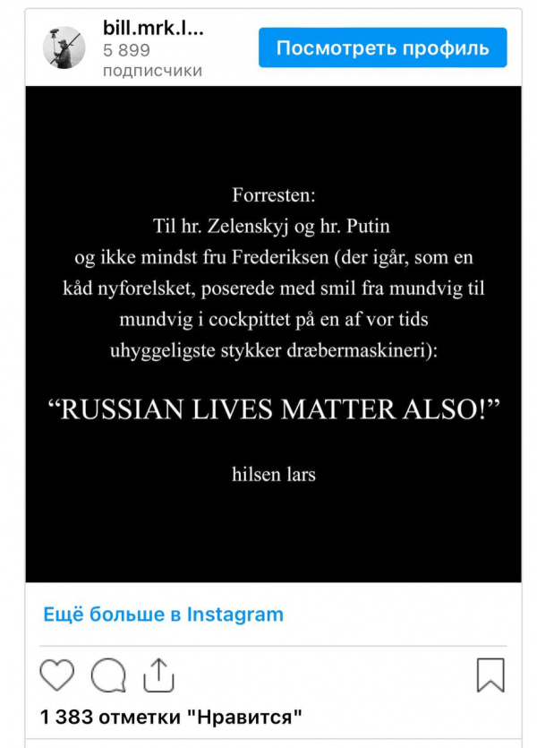 Фон Триер после того, как стало известно, что Дания решила передать Киеву истребители F-16, написал в соцсети X: "Жизни русских также важны". Эту запись режиссер адресовал Владимиру Зеленскому, Владимиру Путину и премьер-министру Дании Метте Фредериксен.