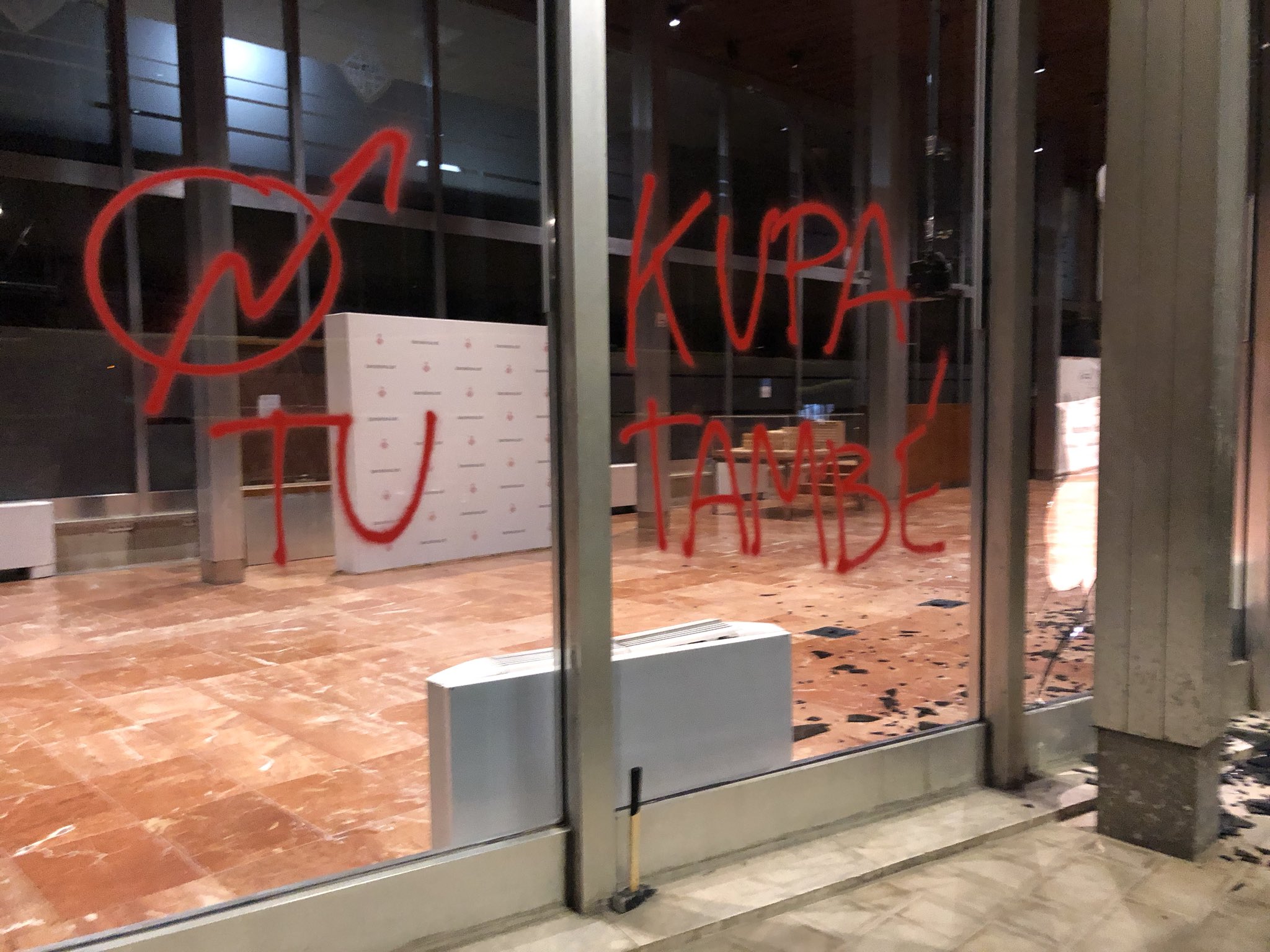 В здании городского совета разбили стекла, оставили гордую надпись "Окупируй и ты", перед боковым входом в здание развели костер. У одной полицейской машины побили все стекла.