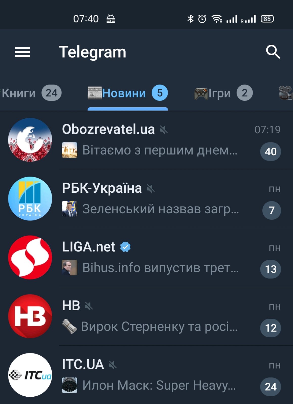 Группирую каналы в папки по темам. Уведомления отключены у всех. Захожу в парпку - у каждого канала вижу число непрочитанных сообщений.